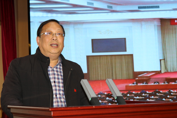 会上,彭开智以《乘势而上开启全面建设社会主义现代化国家新征程》为题,简要介绍了党的十九届五中全会概况,从三个核心文献即中国共产党第十九届中央委员会第五次全体会议公报、习近平关于《中共中央关于制定国民经济和社会发展第十四个五年规划和二〇三五年远景目标的建议》的说明、中共中央关于制定国民经济和社会发展第十四个五年规划和二〇三五年远景目标的建议谈起,论述了十九届五中全会召开的背景、主要成果、《建议》起草情况、《建议》的主要内容和亮点、《建议》的核心要义以及党的全面领导等八个方面的内容,对党的十九届五中全会精神的重要意义和实践指导作用进行了系统的分析和阐述。针对《建议》中的亮点,彭开智结合荆州市在环境治理、改善民生中的举措,系统讲述了首次把全体人民共同富裕取得更为明显的实质性进展作为远景目标提出来这一观点,认为建议稿关于社会领域的内容,超过以往历次规划建议,政策含金量很高,彰显了发展为了人民的理念。