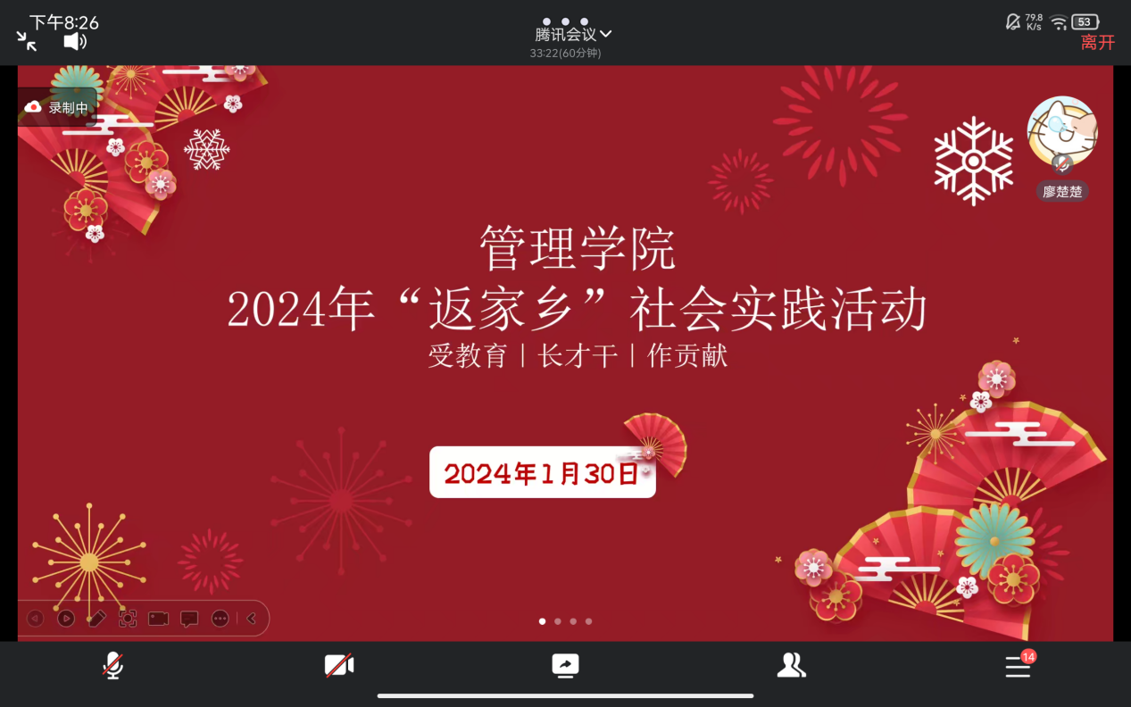线上交流会开始,管理公司“返家乡”社会实践活动负责人廖楚楚按照实践原则,以“受教育、长才干、作贡献”为宗旨,对本次寒假社会实践考核评估要求进行详细介绍。负责人石佳针对考核评估要求给志愿者们提出了指导意见并给出相应建议,同时在提问环节对志愿者们提出的问题进行了一一解答。交流会中特邀请志愿者周光辉、苏宇碟和汪静分别向大家分享自己在实践活动中遇到的问题、如何解决问题以及做志愿以来的感悟和心得。周光辉表示在此次社会实践活动中,了解到每一项工作的辛苦和不易,真正学习到了社会经验,也锻炼了自己的处事能力和人际交往能力,真正做到了学以致用、积极创新。最后,管理公司党总支副书记杨琪对本次线上分享交流会进行了总结,对志愿者们的工作给予肯定,并嘱托志愿者们在完成好自己工作的同时注意身体。