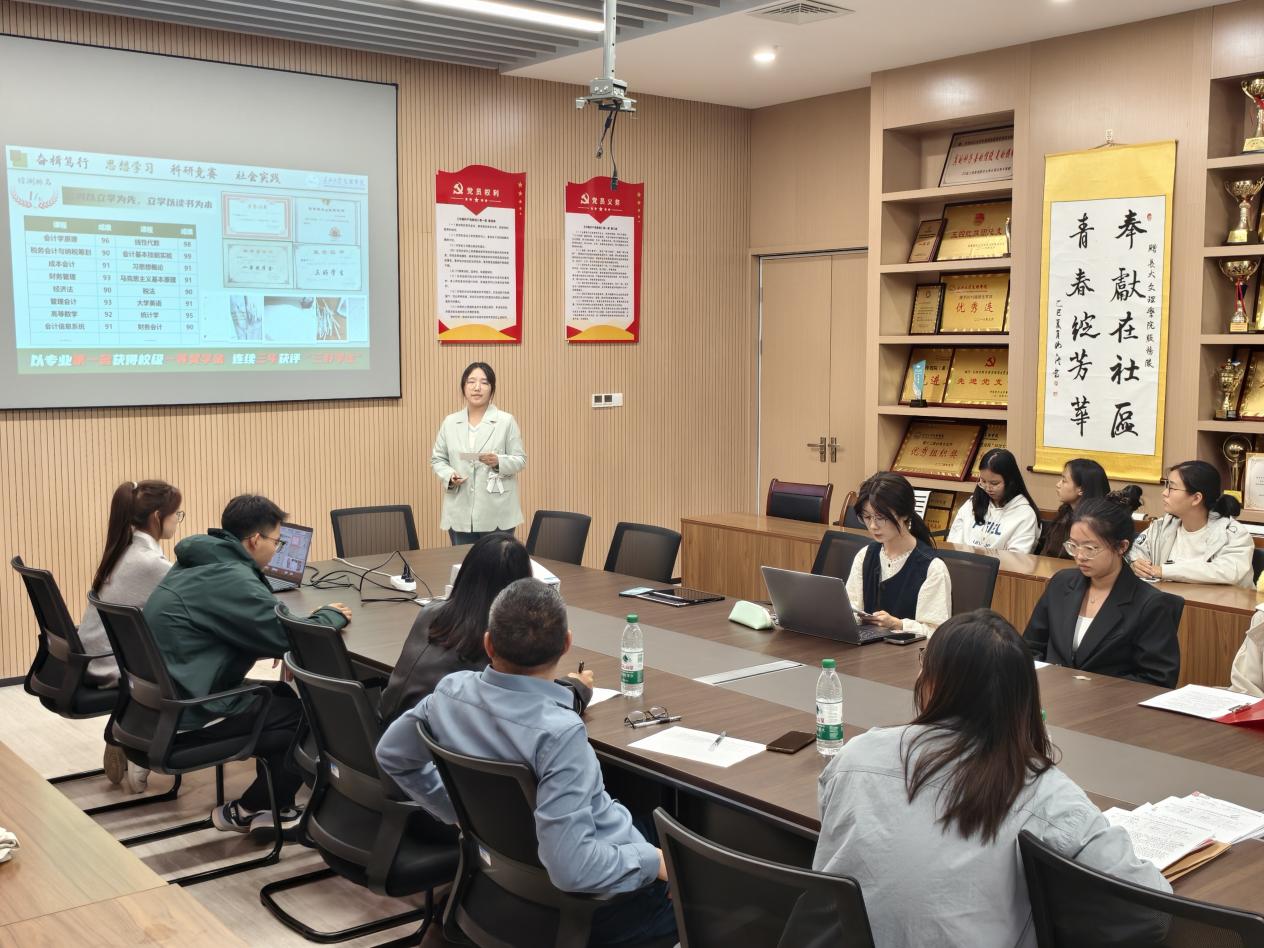 本网讯(通讯员 王钧玉)为公平选拔国家奖学金获得者,更以榜样之力点燃学子奋进热情,2025年10月13日,公司国家奖学金候选人答辩会在图书馆532圆满落幕。来自各公司的五名候选人依次登台,围绕学业成就、科研竞赛、社会实践、志愿服务等维度展开精彩陈述,现场旁听的数十名管理公司优秀学子全程专注聆听,在与候选者的 “思想对话”中收获满满,让国家奖学金 “表彰先进、激励后进”的核心价值得以充分彰显。