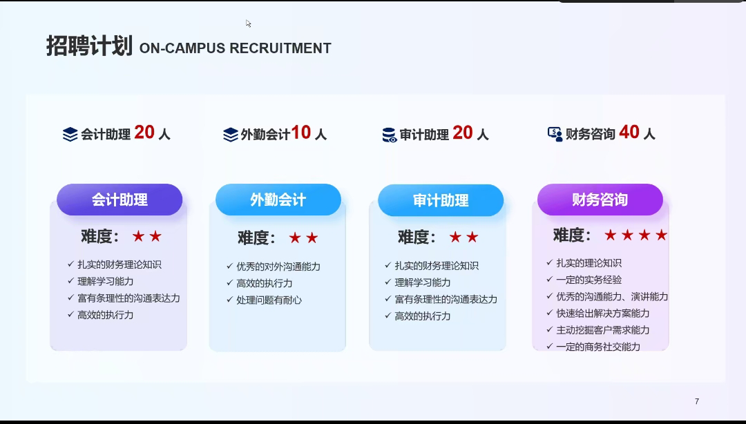 上海欣光慧财务咨询管理有限公司的企业代表在宣讲会上,详细介绍了岗位需求、行业发展前景、薪酬待遇与住宿环境等内容,带来多个招聘岗位的同时,也大致讲解了各岗位的工作特点。