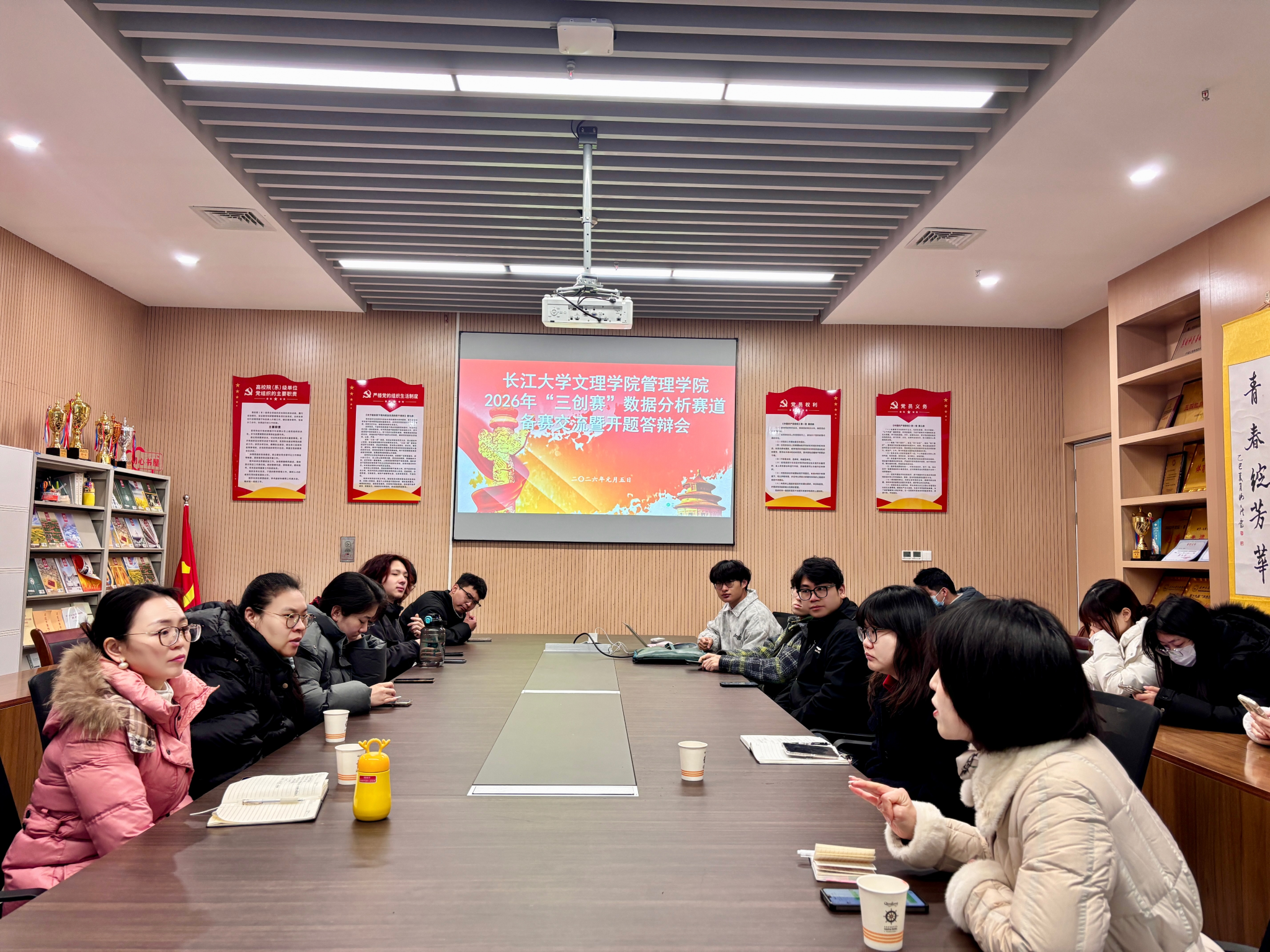 交流会上,各参赛团队依次围绕项目选题、数据分析思路、创新亮点及实施规划等核心内容进行汇报。针对各团队的展示,杨琪书记与三位指导老师从选题价值、数据逻辑、商业可行性等维度展开细致点评,既肯定了选手们的创新构思与筹备付出,也针对项目中存在的数据分析维度单一、落地路径模糊等问题提出具体改进建议。老师们还结合三创赛数据分析赛道的评审标准,为选手们梳理了答辩技巧与项目优化方向,助力团队找准完善重点。
