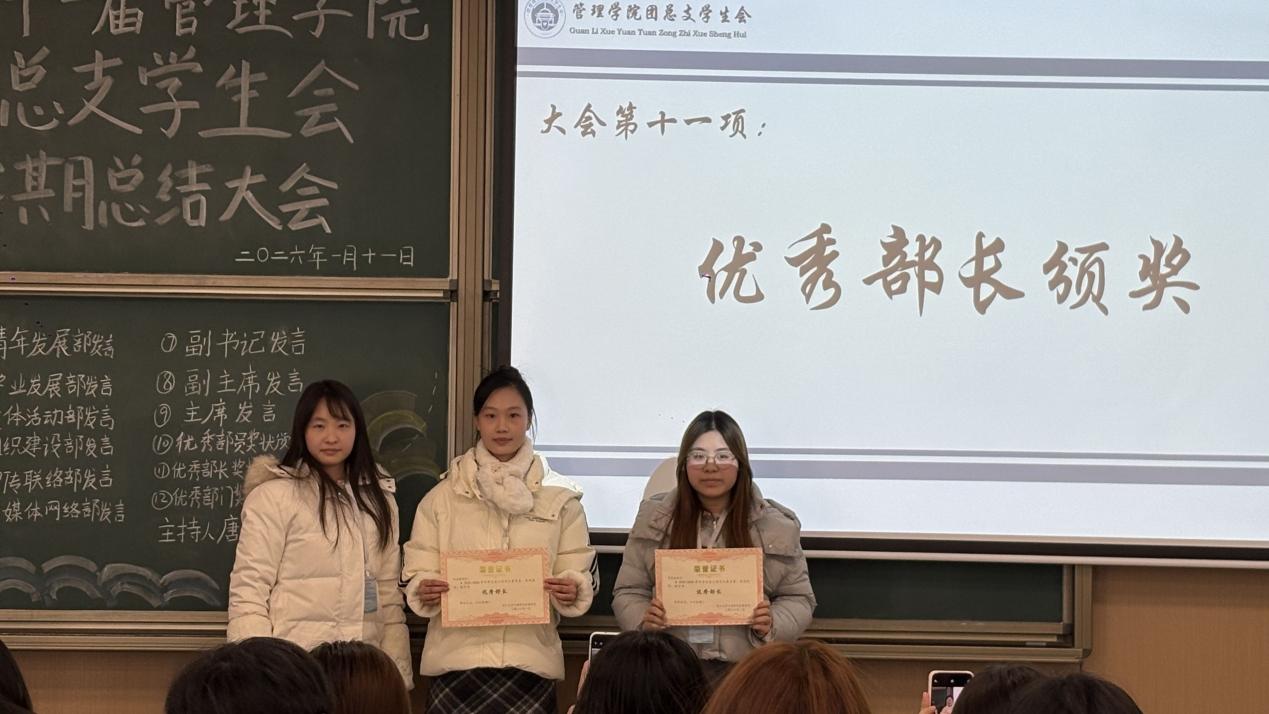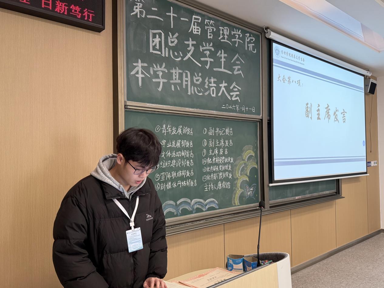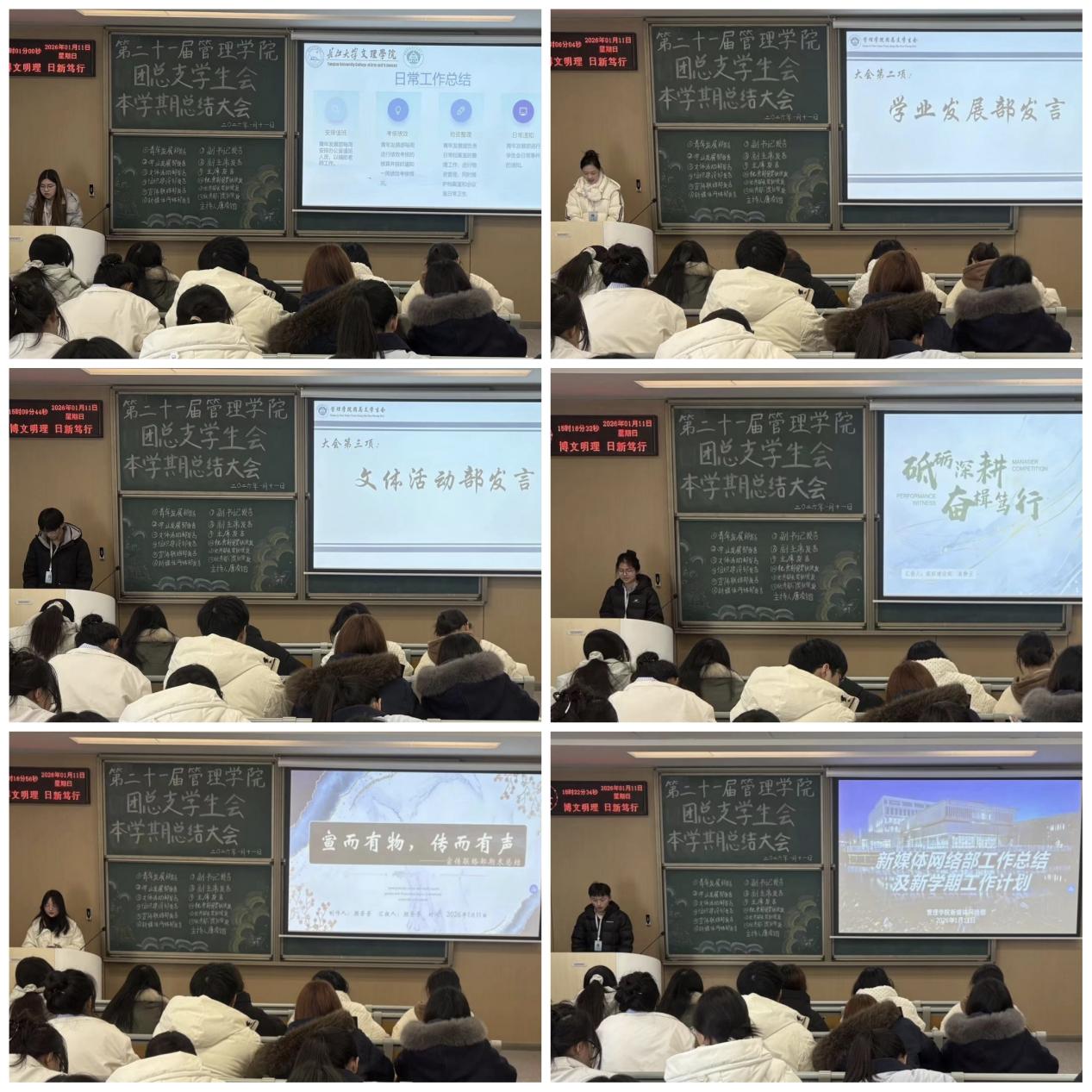 大会依照既定议程有序推进,青年发展部、学业发展部、文体活动部、组织建设部、宣传联络部、新媒体网络部依次上台作工作总结。各部门部长聚焦本学期内工作开展情况,客观梳理了部门在服务同学、组织活动、日常运营等方面的成果,同时直面工作中存在的短板与不足,深入剖析执行过程中暴露的问题与疏漏,还进一步锚定了新学期发展方向,结合部门职能与现存问题,制定切实可行的改进措施与工作规划。