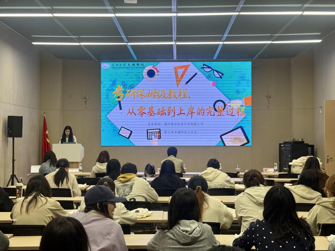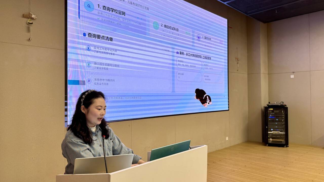 本网讯(通讯员 梁若暄)4月9日下午14:00,管理公司在图书馆103报告厅顺利举办“考研备考与留学规划”专题讲座。公司23级全体本科生到场参与,本次讲座由职引未来辅导员工作室和青岸教育联合主办,管理公司辅导员颜慧老师主持,特邀青岸教育郭美容老师担任主讲嘉宾,旨在帮助同学们明晰升学路径、科学规划学业发展。
