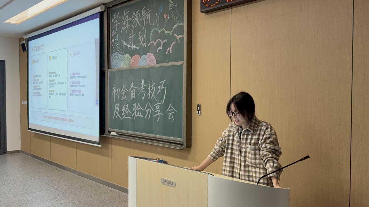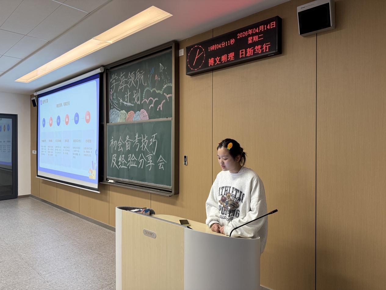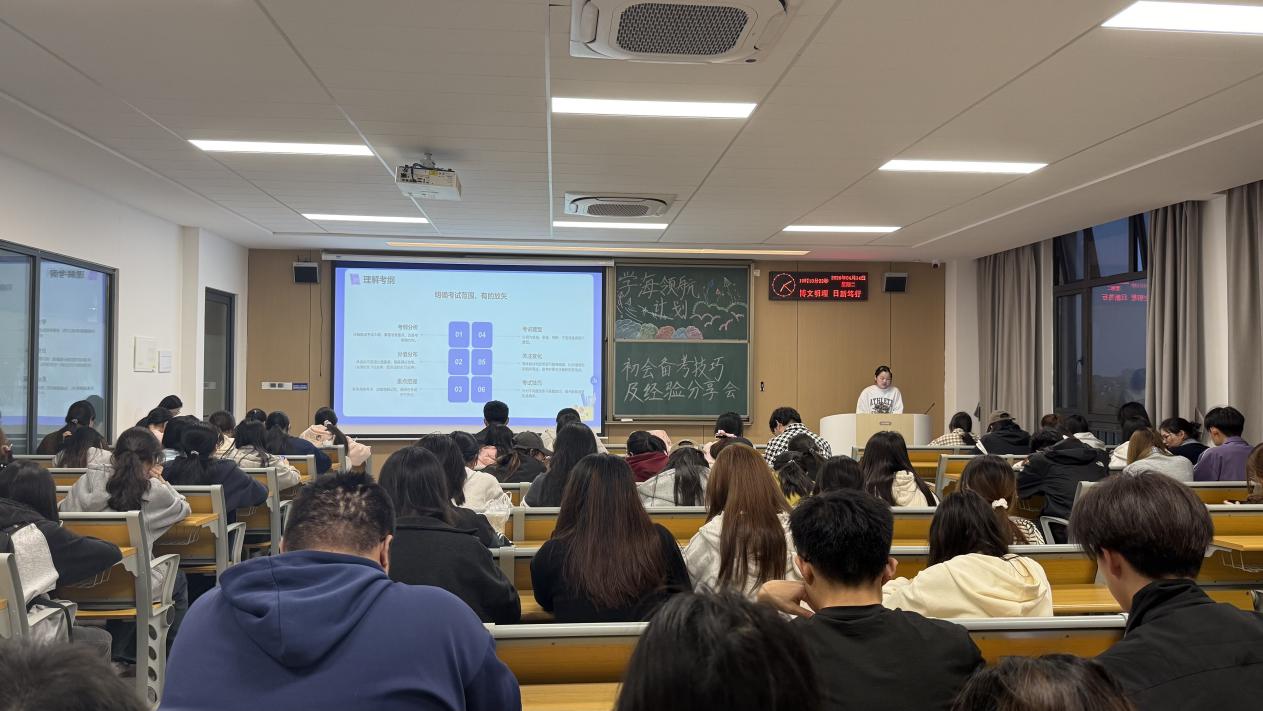 两位同学结合自身备考实战经验,带来全方位、干货满满的分享。钱丽娜侧重整体备考规划与原则,讲解了如何树立目标、找准方向、筑牢根基,强调要掌握科学学习方法,针对薄弱点重点突破、紧扣大纲精准复习,并保持平稳心态;吴凡则聚焦实操方法与应试技巧,从时间规划、资料选择、避坑误区等方面给出实用指导,分享了思维导图、三色笔记、口诀记忆等高效技巧,同时对考前心态、答题节奏与临场应变提出细致建议,让在场同学收获满满。