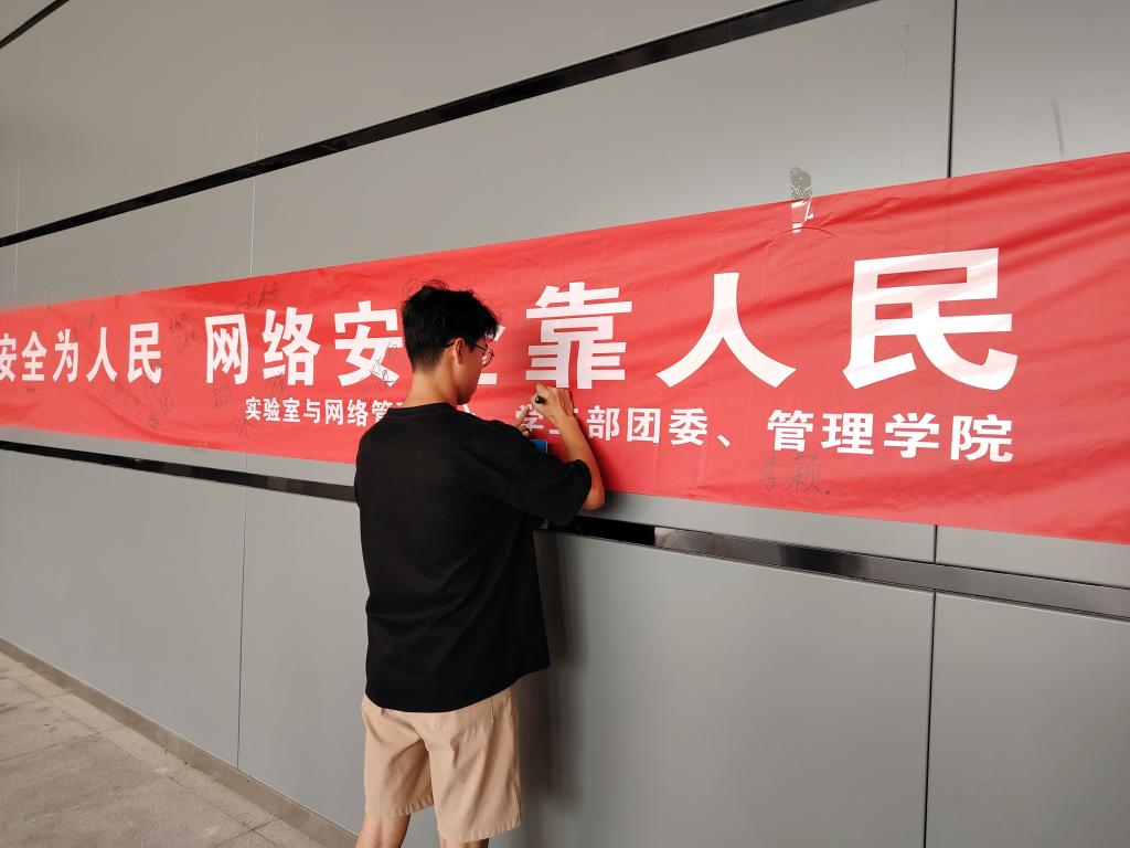 9月14日上午10时,实验室与网络管理中心、学工部团委联合管理公司开展了“网络安全为人民,网络安全靠人民”主题知识竞赛、组织各班员工开展“我承诺我遵守”集体签名活动,联合荆州市公安局在荆街开展网络安全知识的宣传普及活动。