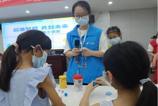 图为志愿者仔细教授小朋友如何制作火箭模型