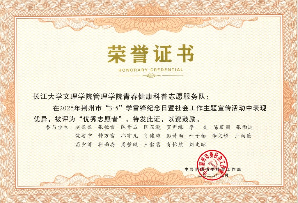 本网讯(通讯员:李晗明)3月18日,管理公司收到喜讯:公司22名青年志愿者因在荆州市"3·5"学雷锋主题宣传活动中的突出表现,获市委社工部授予"优秀志愿者"荣誉称号。