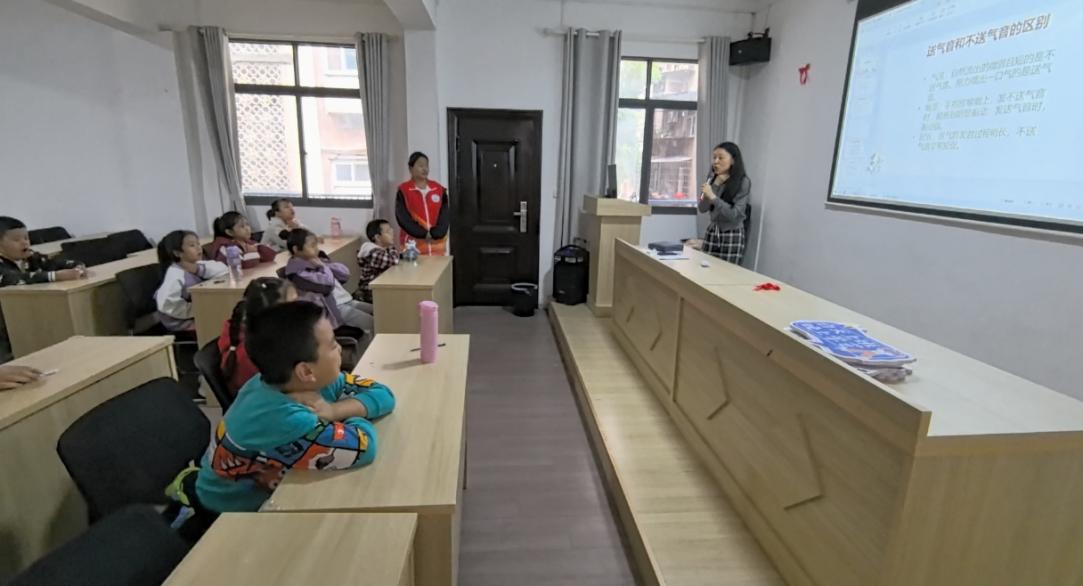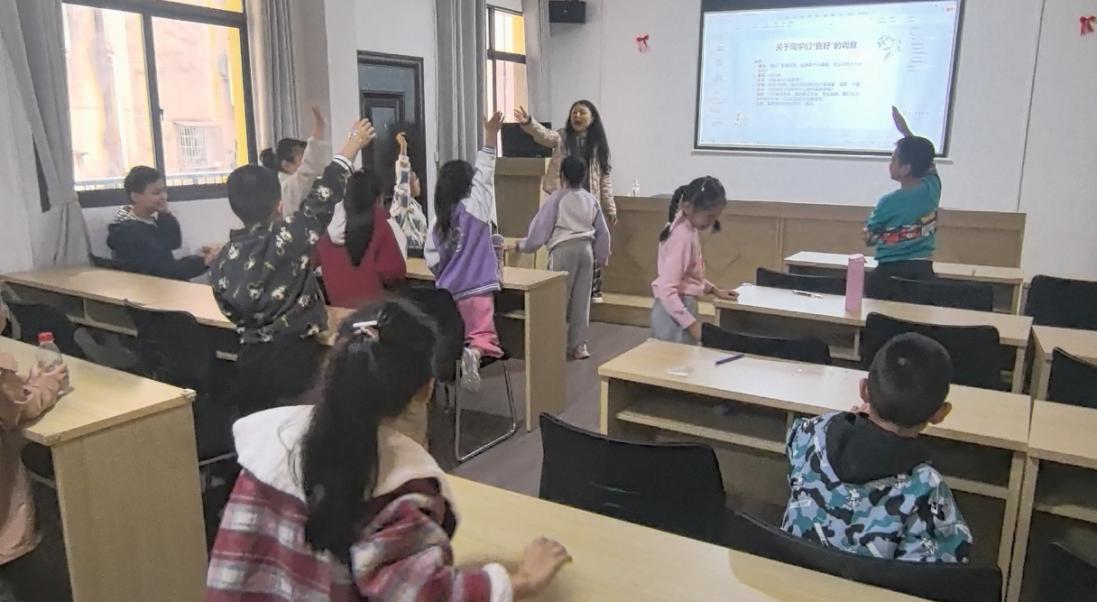 第二节课由朝阳社区邀请的专业老师开展“小小演说家”课程。老师以一段贯口视频展开教学,从21个声母的基础要点入手,通过示范讲解、引导小朋友们开口自己练习,帮助孩子们纠正发音习惯。随后的“模拟采访”环节将课堂氛围推向高潮,孩子们分别扮演采访者与被采访者,结合生活场景设计问题、灵活应答,现场氛围热烈,小朋友们踊跃举手发言,充分展现出活泼开朗的精神风貌。