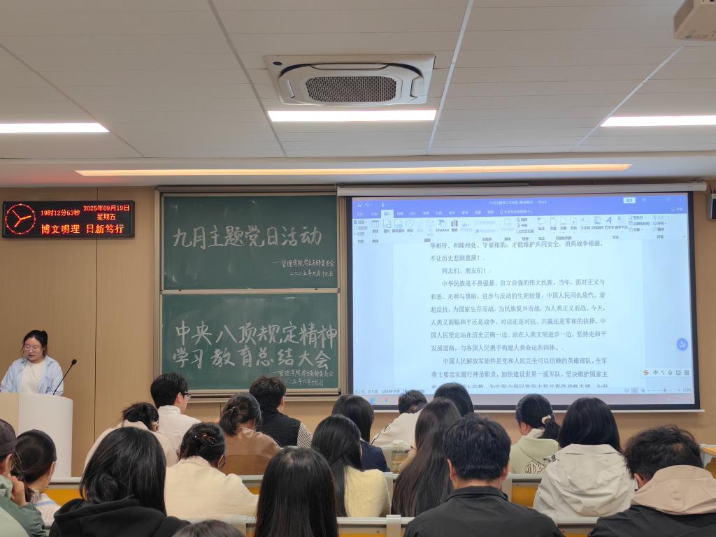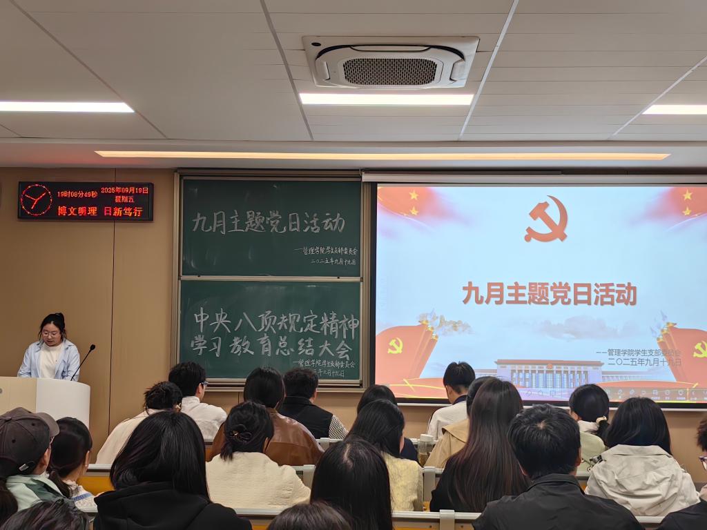 本网讯(通讯员黄江琴)管理公司员工党支部于9月19日晚19:00,在教学楼A402召开九月主题党日活动,管理公司全体党员参加。此次会议的学习主题是“巩固拓展学习教育成果,推进作风建设常态化长效化”。会议由汪李雨涵同志主持。