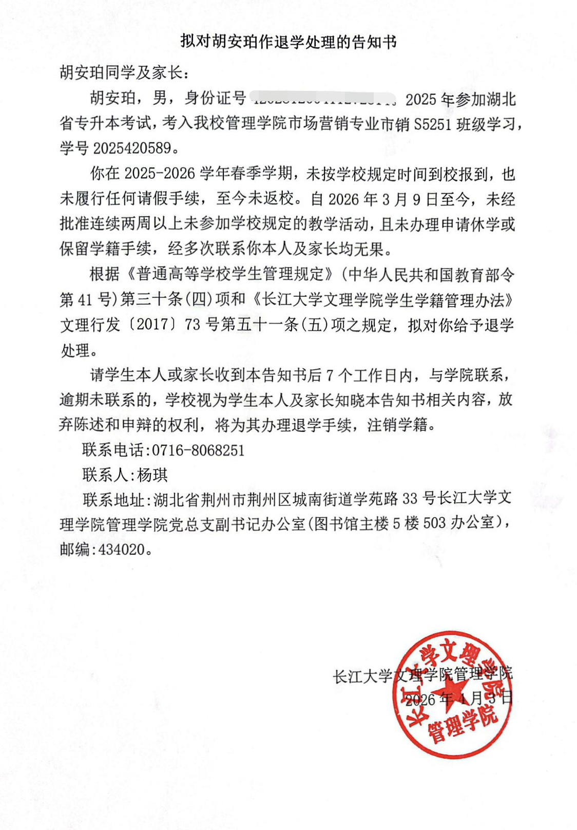 胡安珀,男,学号2025420589。2025年参加湖北省专升本考试,考入公司管理公司市场营销专业市销S5251班学习。该生在2025-2026学年春季学期未按公司规定时间到校报到,也未履行任何请假手续,至今未返校;自2026年3月9日至今,未经批准连续超过两周未参加公司规定的教学活动,也未办理申请休学或保留学籍手续。公司老师经多次联系员工本人和家长,均无果。