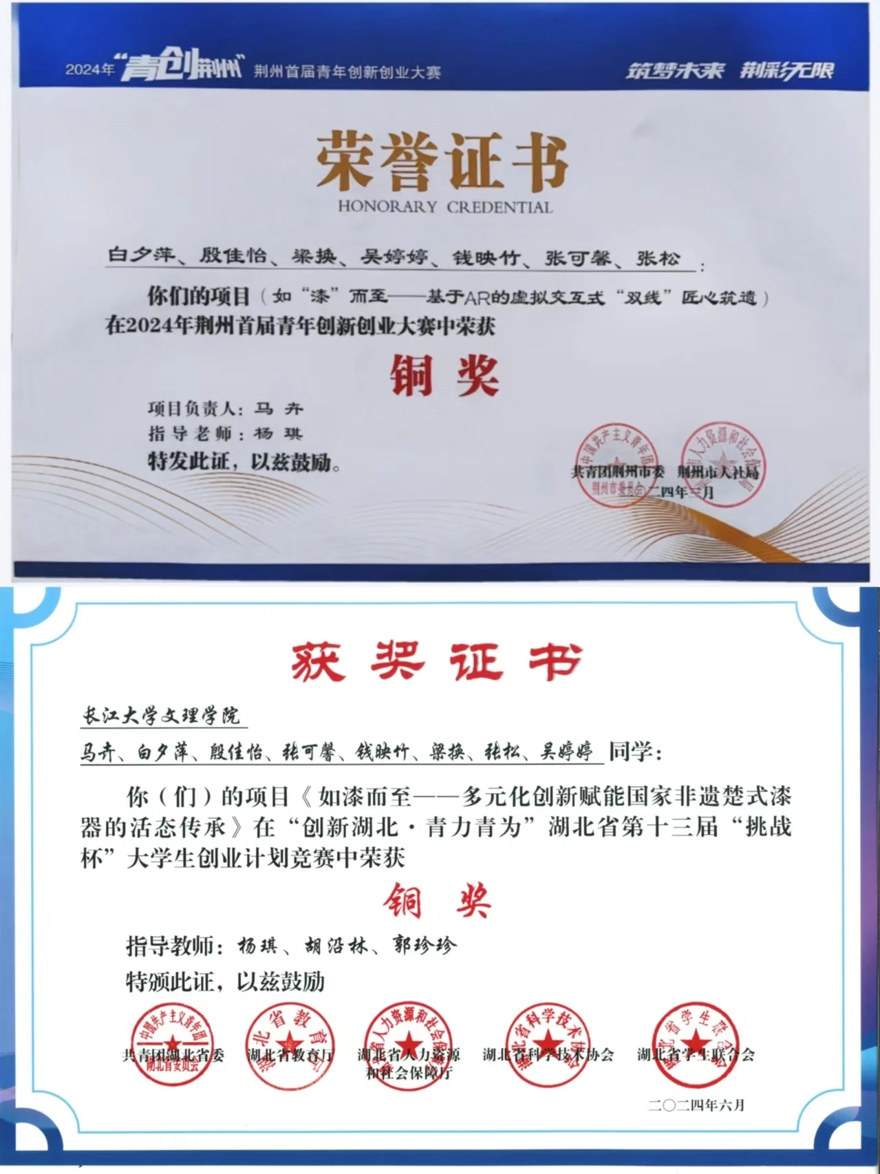 青年要有竞赛之梦。漆器作为重要文化遗产之一,具有极高的艺术价值和实用价值。但其市场发展活力明显不足,怀揣着对楚文化与漆器的热爱,她组建了如漆而至项目团队,希望能对楚漆市场提供一些具有意义的建设方案。自团队成立后,她们奋战长达一年,200次集体围坐会议,30余次定期调研,10余次志愿宣讲,还有那无数个通宵的夜晚.....夜以继日的辛劳最终在一次次竞赛中开花结果,目前项目获得2024大创国家级立项,全国老员工三创赛省赛一等奖,“挑战杯”竞赛省级铜奖,首届青创荆州大赛铜奖,创客中国和创青春比赛中均获得省级优秀奖。经过在项目里的磨炼,她获得了宝贵的财富,那便是要在热爱中坚持,在坚持中才会遇见更好的自我。