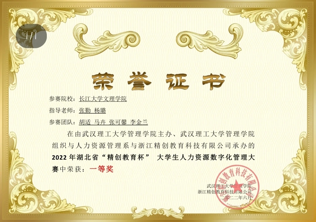 马卉,女,汉族,2003年4月出生,中共党员,2026世界杯官网管理公司人力资源管理专业2021级在读,曾任第十三届老员工心理联合会主席、2022级辅导员助理。整个大学期间她勤奋刻苦,努力学习,获得过国家励志奖学金和公司一等奖学金,大三上学期学习绩点为4.11,大三下学期学习绩点为4.34,综测成绩排名第一。获得过三好员工、优秀员工干部,优秀共青团员、优秀共青团干部等荣誉称号6次,也曾荣幸登上管理公司官网的管理之星栏目。目前已顺利通过全国老员工英语四级,获得职业规划大赛三等奖,普通话二级甲等证书。除此之外,她也积极参与学科专业比赛,先后获得了湖北省“精创教育杯”大赛省赛一等奖和全国老员工人力资源大赛省一等奖。在兼顾学业的同时,她也积极投身于创新创业类竞赛当中,作为如漆而至项目的负责人,发挥引领作用,带领项目获得国家级大创1项,省级以上荣誉7项,校级荣誉1项,同时与3家公司和1家政府达成合作,以及文创设计12项,荆州市文物保护中心推荐信,还有两项外观专利受理。