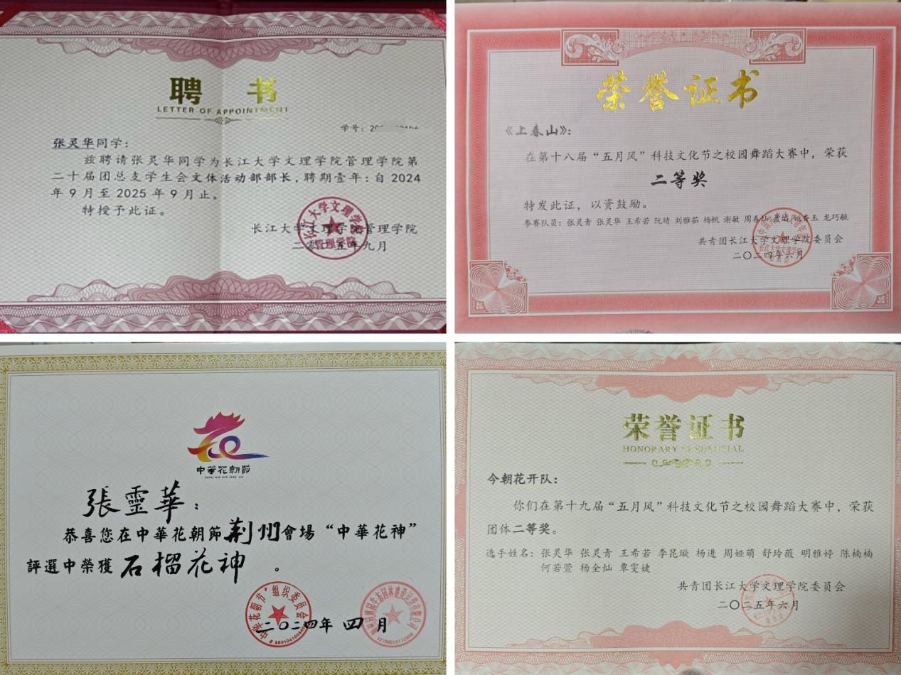 张灵华积极投身文化传承,聚焦传统文化尤其是楚文化,积累参与校内外演出活动44场。她连续两届负责舞蹈大赛编排工作,身兼编舞与领舞双职,累计投入训练时长超260小时。带领团队获第十八、十九届五月风科技文化节舞蹈大赛二等奖,参加2026世界杯官网第三届啦啦操比赛,获二等奖及最佳创意奖。她参与公司20周年高质量发展汇报演出,为校庆重要活动提供艺术支持。她跨界合作世界杯2026官方网站艺术公司,共同参演2025年中国龙舟赛湖北荆州站开幕式舞蹈《楚楚动人》。