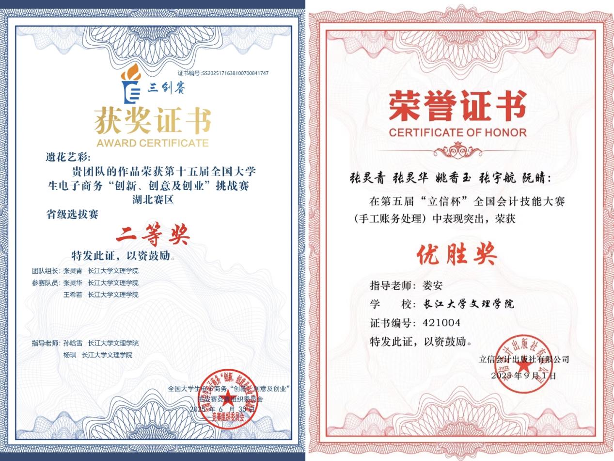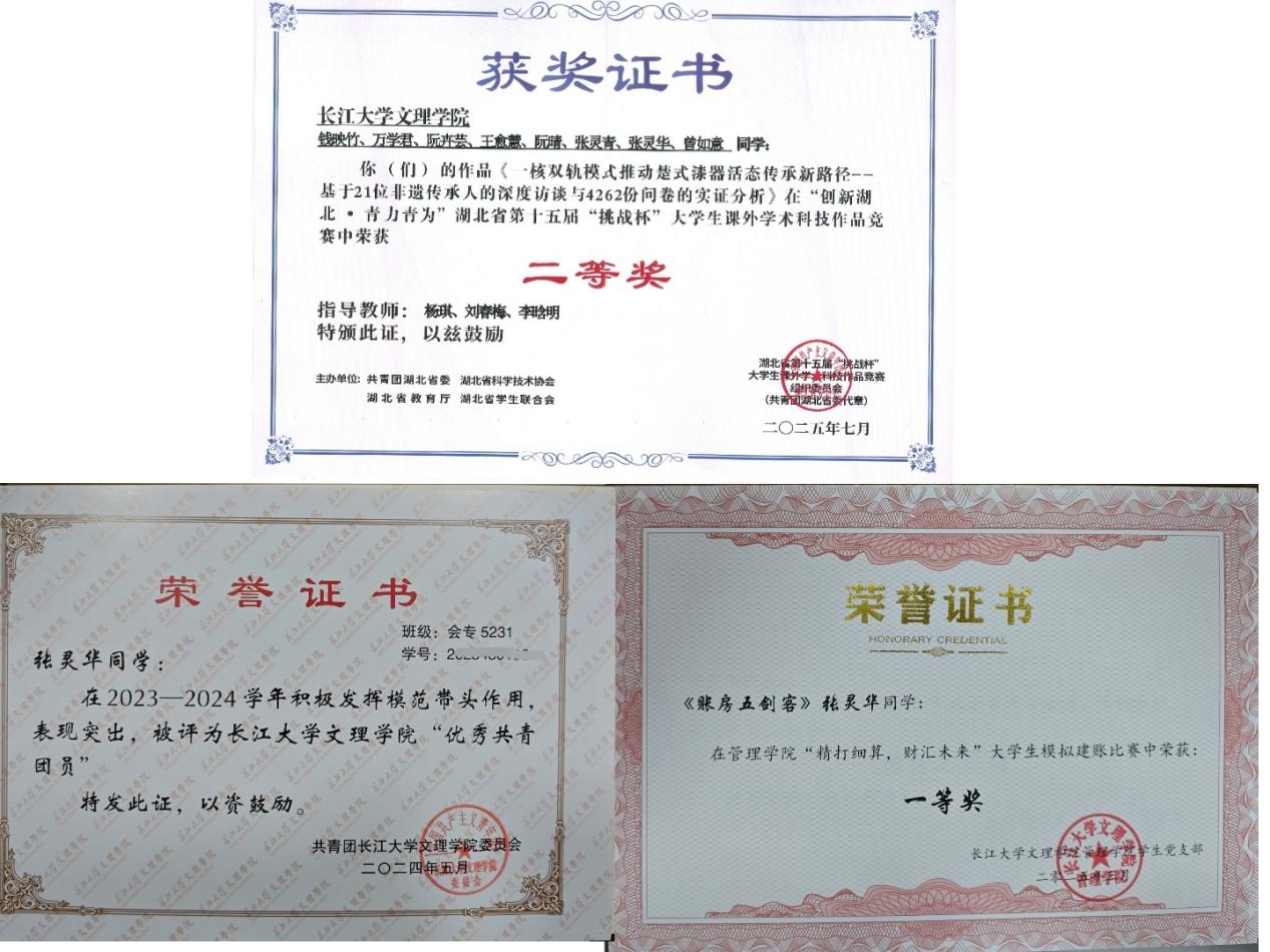 对楚文化的热爱,是张灵华成长路上最鲜明的底色。她将这份热爱融入实践,在非遗传承中寻找青年担当。她先后聚焦两项非遗项目,从楚式漆器的“活态传承”到非遗缠花的“链上新生”,在第十五届“挑战杯”大赛中获省赛二等奖,在第十五届电子商务“三创”赛中获省赛二等奖。
