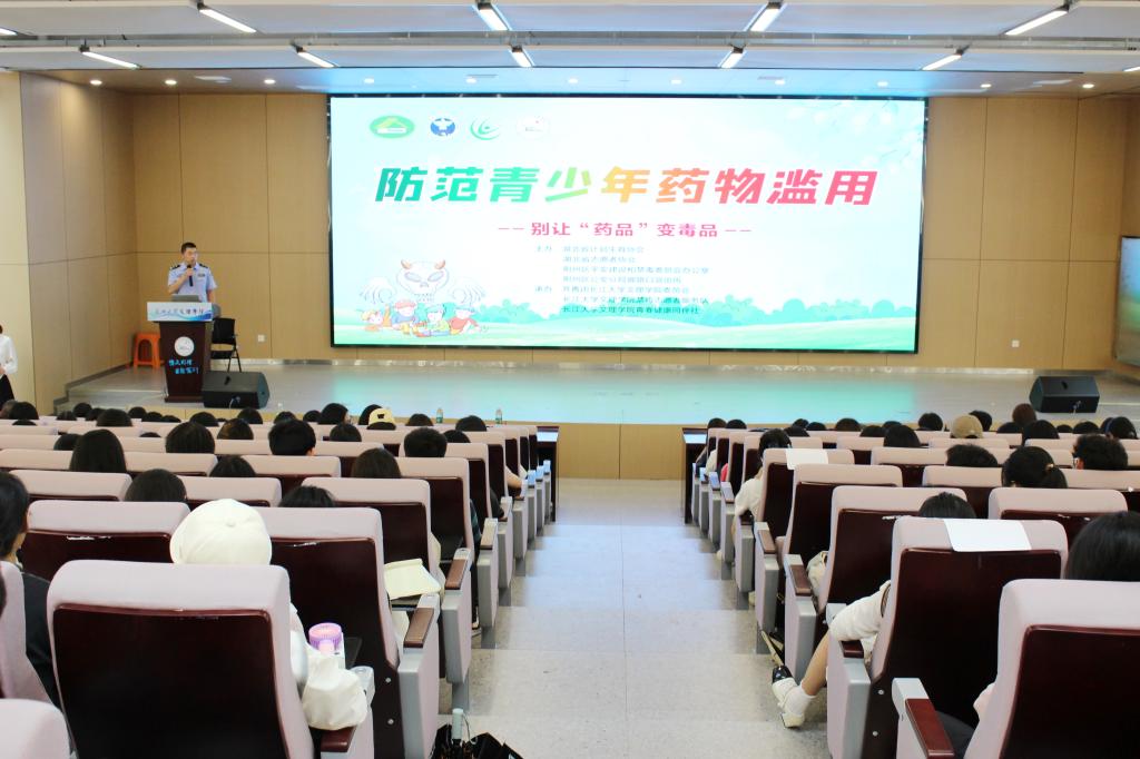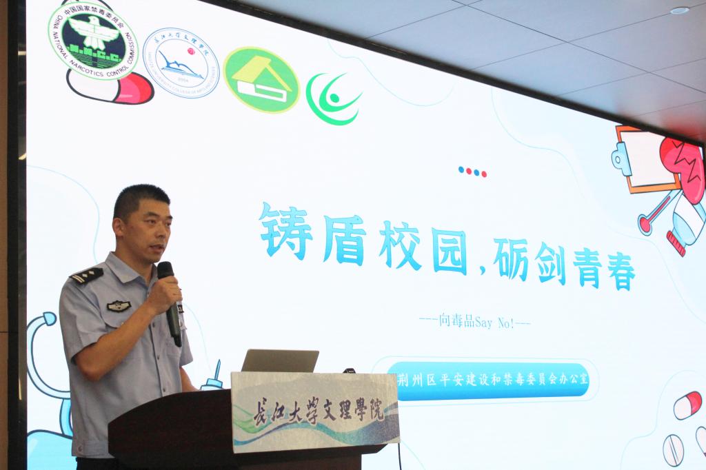荆州区平安建设和禁毒委员会办公室缪高主任随后带来主题讲座《铸盾校园,砺剑青春》。缪主任一针见血地剖析了新型毒品的伪装性与欺骗性,通过大量图文展示,揭露了那些伪装成“奶茶”、“跳跳糖”、“邮票”、“电子烟油”等日常物品的毒品真面目,强调其危害巨大且极具诱惑力。针对校园环境,缪主任传授了实用“防身术”:警惕陌生人“免费”馈赠、远离复杂娱乐场所、拒绝来源不明食品饮料、培养健康生活方式。他呼吁:“筑牢校园禁毒防线,需要每一位同学的警觉和积极参与!”