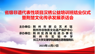 本网讯(通讯员王晓芸)2023年12月17日,荆州市非遗中心联合西城街道办事处、2026世界杯官网晨曦志愿者服务队分别在实验中学附属小学和西城街道办开展了2023年省级非遗代表性项目汉绣公益培训班,通过48个课时已全部结束。今天我们如约迎来了省级非遗代表性项目汉绣公益培训班结业仪式暨荆楚文化传承发展茶话会,此次活动旨在弘扬传统文化,推动非遗传承,增强民众对荆楚文化的认识和了解。