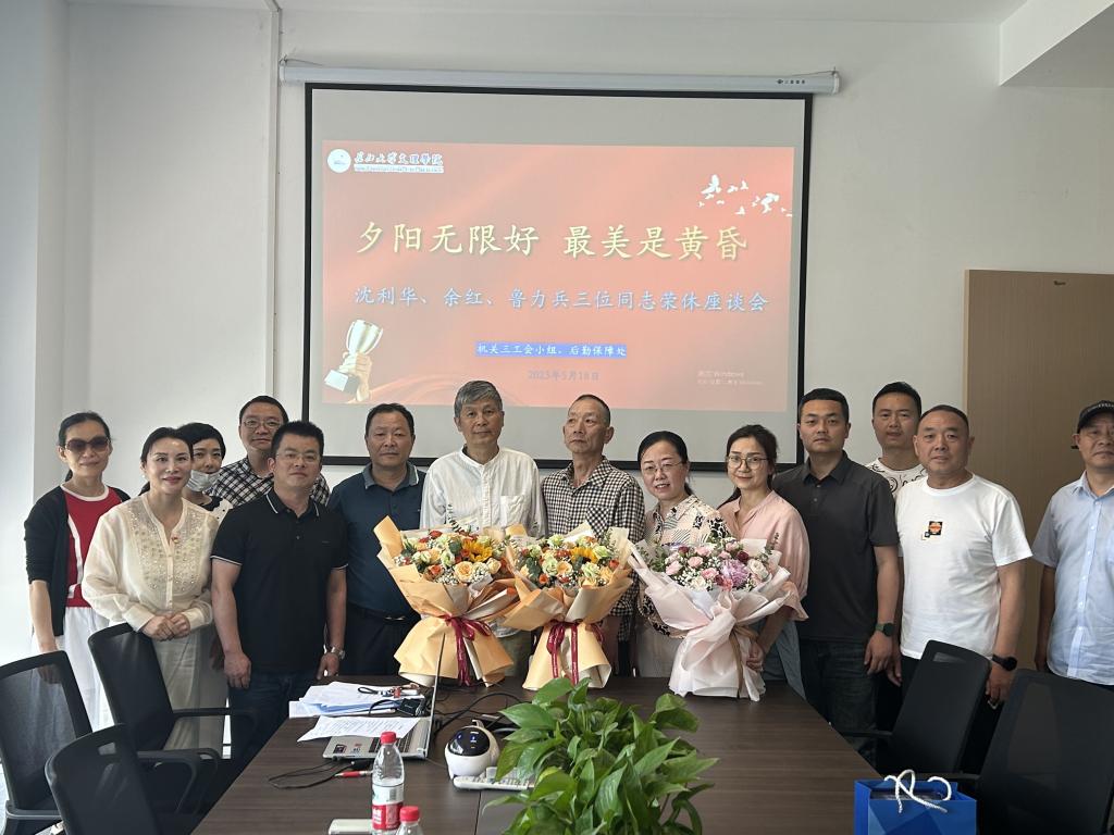 5月18日下午,机关三工会小组、后勤保障处为即将退休的余红、沈利华、鲁力兵三位职工举办荣休座谈会。经理助理郭明虎、工会主席刘磊、机关三工会小组代表及后勤保障处全体教职工参加,座谈会由机关三支部书记曲莉主持。