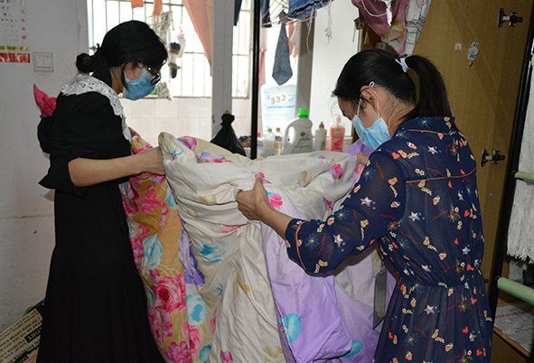 在7舍128寝室,管理系老师王立如同姐姐一般为员工整理床铺、收拾行李,亲切叮嘱需要注意的事项……同样温暖的一幕幕发生在校园里的每个角落。