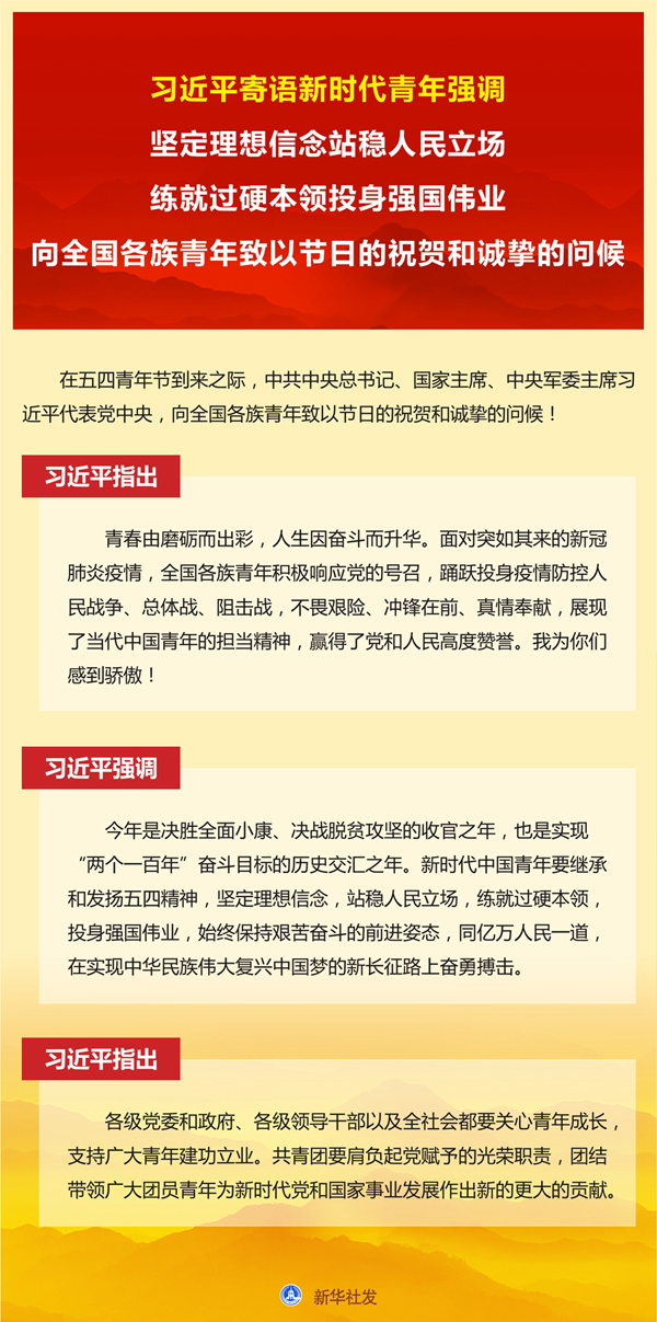 习近平强调,今年是决胜全面小康、决战脱贫攻坚的收官之年,也是实现“两个一百年”奋斗目标的历史交汇之年。新时代中国青年要继承和发扬五四精神,坚定理想信念,站稳人民立场,练就过硬本领,投身强国伟业,始终保持艰苦奋斗的前进姿态,同亿万人民一道,在实现中华民族伟大复兴中国梦的新长征路上奋勇搏击。