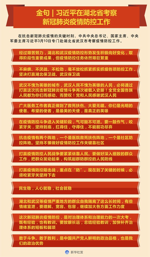 习近平强调,打赢疫情防控阻击战,重点在“防”。现在到了关键的时候,必须咬紧牙关坚持下去。要紧紧依靠人民群众,充分发动人民群众,提高群众自我服务、自我防护能力。要加强进出人员管理,深入开展流行病学调查工作。要保持内防扩散、外防输出的防控策略,同时要在做好健康管理、落实防控措施的前提下,采取“点对点、一站式”的办法,集中精准输送务工人员安全返岗,帮助外地滞留在鄂人员安全有序返乡。