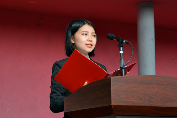 数理与医护系向澳兰代表新生发言。她说,人生理想的风帆要靠奋斗来扬起,而大学正是奋斗的起点,大家要仰望星空、树立远大理想,坚定信念、热爱伟大祖园,躬身实践、担当时代责任,用实践铸造明日的辉煌。