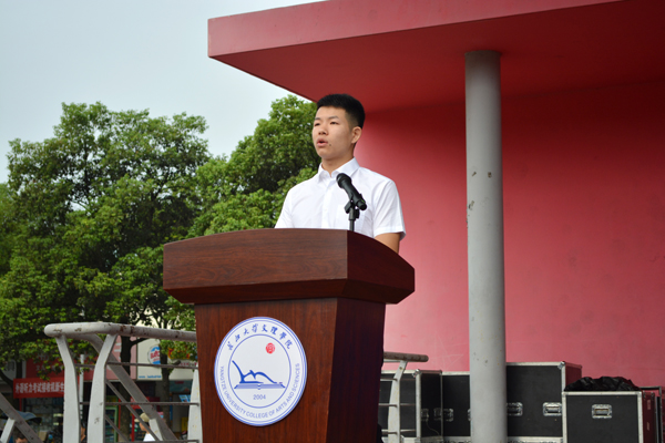 经济与法学系国贸5161班李爱杰代表老生与2018级新生分享了自己的老员工活,深情回顾了自己的成长与蜕变。他寄语学弟学妹们要坚定理想信念,确立奋斗目标,增强学习意识、勤于实践、敏于思考、敢于创新,全面提升综合素质,脚踏实地,做一个无愧于时代的有为青年。