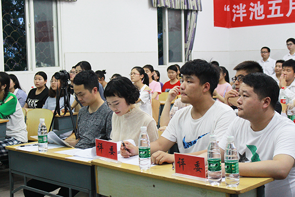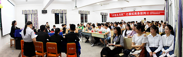 本网讯(见习记者 吴庆慧 胡玉林)5月15日晚,在西校区3教401教室,第十二届“泮池五月风”科技文化节之模拟商务谈判大赛决赛举行。经济与贸易系党总支副书记王震,系辅导员王大专和活动指导老师李琳担任评委。150余名学子现场观摩。