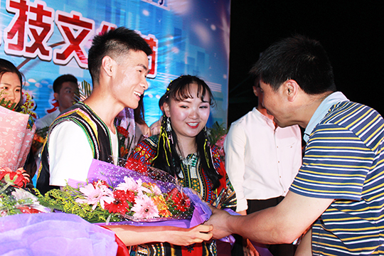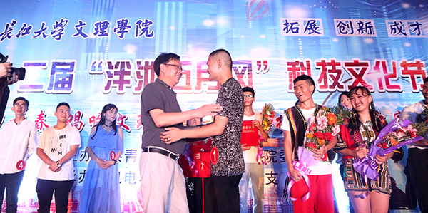 梅平、李琴、郭睦庚和相关系部负责人为获奖选手颁奖。在为冠军毛兴民同学颁奖时,梅经理为他的歌喉和出色表现点赞,鼓励他发扬比赛精神,在今后的学习中取得更好的成绩和更大的进步。