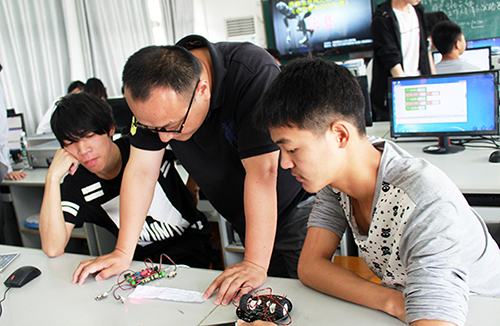 赛场上,选手们聚精会神紧盯电脑屏幕,手中不停组装机器人套件,认真思索,沉着答题。机房里异常安静,只听得见手指轻敲键盘和小组成员小声讨论的声音。 有一组同学正在现场制作“走正方形的机器小车”。他们利用所学物理知识,沉着冷静、耐心细致地协调配合,经过十几次的数据输入和结果测试,最终在既定时间内出色完成任务。
