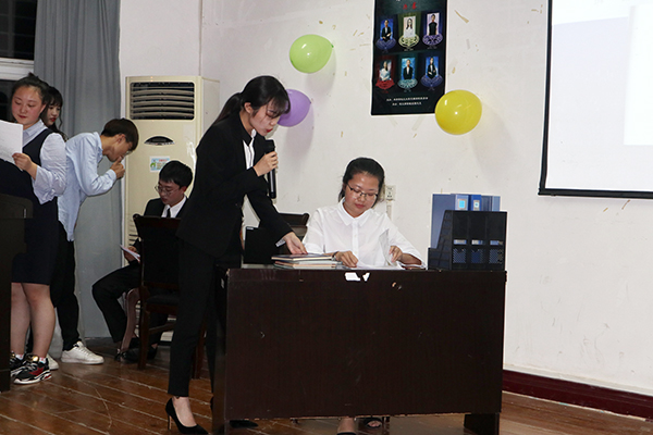 本网讯(见习记者 赵娟 余永航 杨丹丹)5月20日晚,在城中校区学术报告厅,第十二届“泮池五月风”之“明日之仕”模拟招聘大赛决赛举行。特邀嘉宾、某商业集团总经理樊勇红先生、工商管理系教师张勤、辅导员罗凯敏、胡沿林担任大赛评委。百余名师生现场观摩。