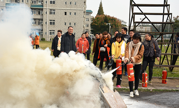 针对模拟火情,教职工进行了实地灭火演练。