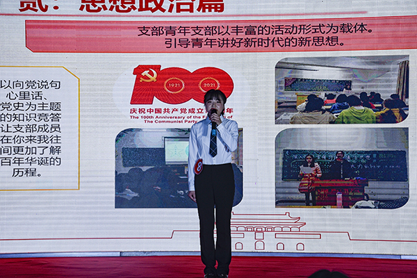 各班级团支部依次围绕《明天会更好》《青年兴则国兴》《学党史、知党恩,争做时代新青年》《青春向党,奋斗强国》《凝聚青春力量,彰显支部活力》《献礼百年征程》《爱国爱党,从我做起》等红色主题展示支部风采,唱响主旋律,绽放青春风采。展示结束后,各班级团支部围绕庆祝建党100周年主题,表演了合唱、话剧、情景剧、诗朗诵等不同类型的艺术节目。赵子矜、韩立同学担纲比赛主持,吴立娜、王玲玲、田丹3名老师担任评委。