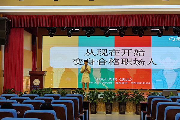 本网讯(通讯员 赵欣雨)近日,外国语公司在城中校区多功能报告厅举办优秀员工主题讲座,2011届员工周庆以“从现在开始,变身合格职场人”为题作讲座,外国语公司师生代表近两百人现场聆听。