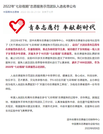 教育系微光志愿者服务队入选2022年“七彩假期”全国示范团队