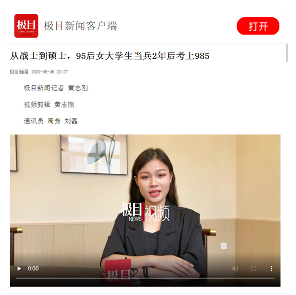 本网讯 近日,外国语公司商务英语专业大四员工田蕊顺利考取武汉大学硕士研究生,该事迹经公司宣传部宣传报道后,由极目新闻记者后续进行视频采访报道,该新闻刊发后,先后被楚天都市报、腾讯新闻、网易新闻、今日头条、搜狐网、西瓜视频等各大网络平台转载,获得了较高的关注度。