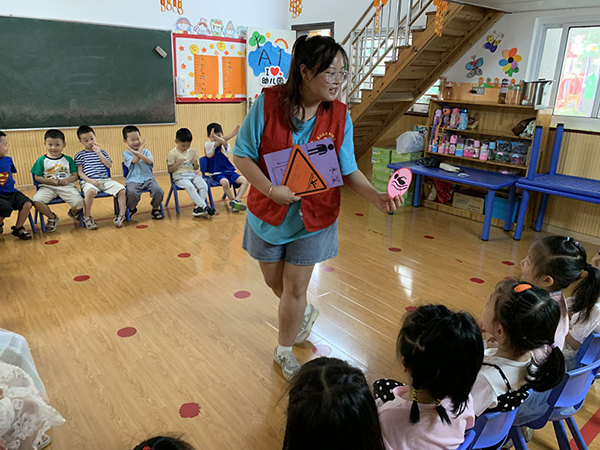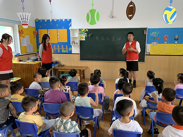 本网讯(通讯员 谭润物)近日,高职部文专班一批员工代表在支部书记黄婷婷的带领下前往荆州区神童早教幼儿园开展“防溺水知识宣讲”志愿服务活动,向幼儿普及了如何选择正确的地方游泳、游泳戏水之前的注意事项、遇到有人溺水应该怎么办等方面的小知识。8个志愿者分为3个小组分别进入A1、A2、B1三个教学班与幼儿们进行互动学习,为70多名幼儿上了一堂生动的“珍爱生命预防溺水”安全防护课。