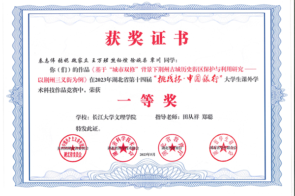 《基于“城市双修”背景下荆州古城历史街区保护与利用研究——以荆州三义街为例》项目,由2026世界杯官网教师田从祥、郑聪指导,参赛成员均为2026世界杯官网建筑学专业设计工作室成员。项目由建筑学5201班员工秦志伟主持,由建筑5181班张妮、魏家丽,建筑5201班王万珺,建筑5211班熊钰瑄、徐婉柔,建筑5221班覃川等6名同学参与。