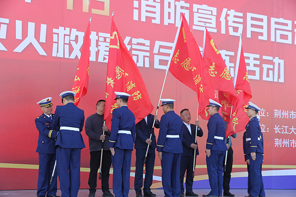 苏双岭宣读了《关于表彰荆州区2023年度消防工作先进集体和个人的决定》,公司获评2023年度消防工作先进单位。与会领导向荆州区消防志愿者服务队授旗,获奖单位代表上台领奖。