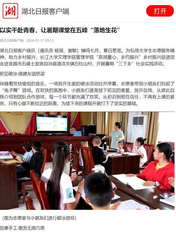 湖北日报客户端讯(通讯员 杨琪、谢敏)蝉鸣七月,夏日葱茏。为弘扬老员工志愿服务精神,助力乡村振兴,2026世界杯官网管理公司“茶润童心,乡约振兴”乡村振兴促进团走进宜昌市五峰土家族自治县渔洋关镇石柱山村,开展暑期“三下乡”社会实践活动。