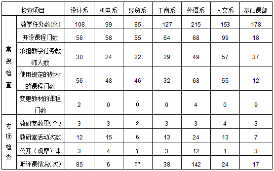 按照《2015~2016学年第一学期期中教学检查的通知》要求,在院领导的带领下,教务处联合督导组深入各教学单位开展了专项检查工作。此次检查分两个阶段:第一阶段由各系部领导带队自查,并提交期中教学检查工作总结、教师和员工座谈会总结、课堂教学检查记载表、系部教师听课记录表;第二阶段由教务处组织抽查,每项工作均有检查内容、标准、依据、形式以及检查执行人,各项检查情况如下: