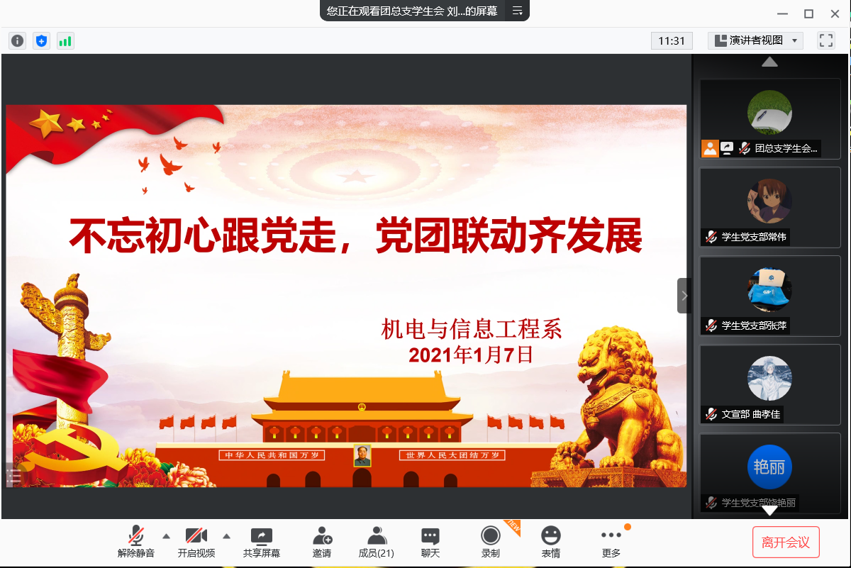 本网讯(员工记者 曲孝佳)1月7日下午,在腾讯会议平台上,我系召开不忘初心跟党走,党团联动齐发展专题线上会议,会议由员工会主席刘豪杰主持,系党总支副书记辛裕出席,第十六届团学组织全体部长和员工党支部全体成员共同参与。