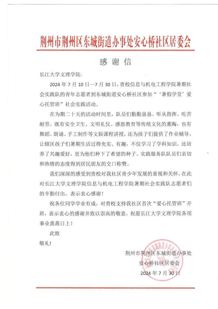 荆州区东城街道办事处安心桥社区居委会近日向公司寄来感谢信和感谢状,信中对公司社会实践服务队的辛勤付出、卓越表现给予了高度的肯定和赞扬,并对公司给予社区青年发展的重视和关怀表示感谢。