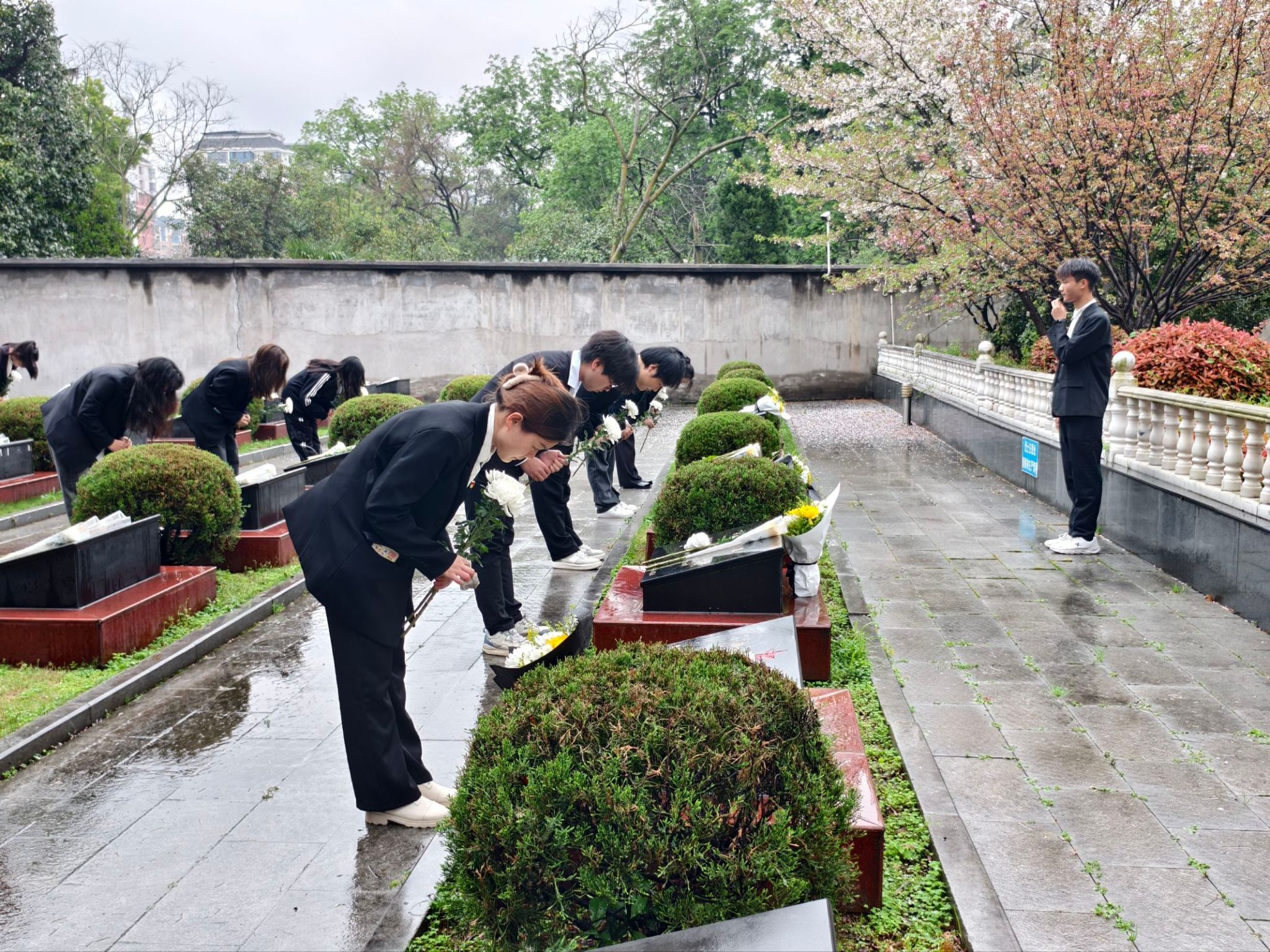 当日下午,全体同学身着正装、手捧白菊,前往烈士陵园开展清明祭扫活动。仪式在庄严的国歌中正式拉开帷幕,全体师生肃立默哀,深切缅怀革命先烈。员工代表上前整理花篮缎带,深情讲述英雄事迹,全体人员一同重温入党誓词,砥砺初心使命。