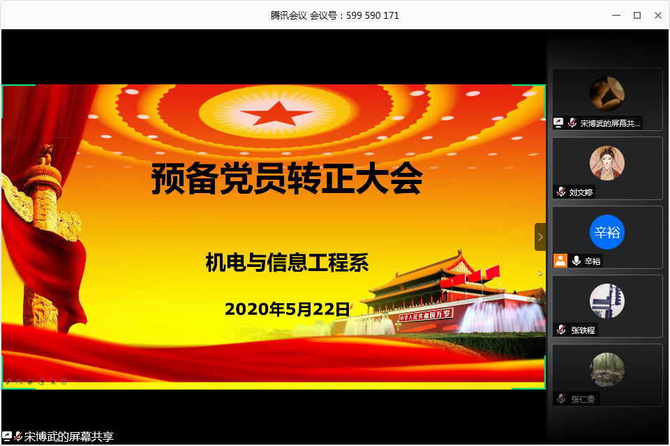 本网讯(员工记者 刘文婷)5月22日中午,在腾讯会议平台,我系员工党支部召开线上预备党员转正大会。会议讨论表决宋聪聪、吴神鞭、杨小丰、钱瑞、熊梦园、刘文婷六名同志的转正事项。系党总支副书记辛裕主持会议,相关培养考察人一同参与。