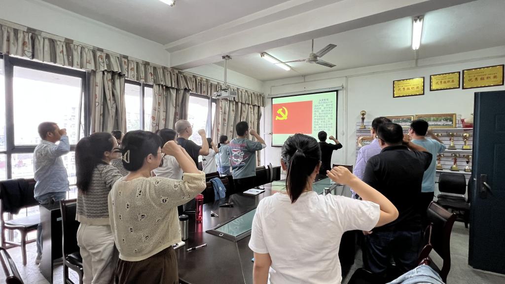 在支部主题党日活动中,全体党员重温入党誓词、交纳党费、集体诵读《中国共产党章程》第七章,学习了《习近平谈治国理政》第四卷第一部分“掌握历史主动,在新时代更好坚持和发展中国特色社会主义”、湖北省第十二次党代会精神、世界杯2026官方网站党委书记王建平、董事长冯征在世界杯2026官方网站暑期研讨会上的讲话精神等内容。