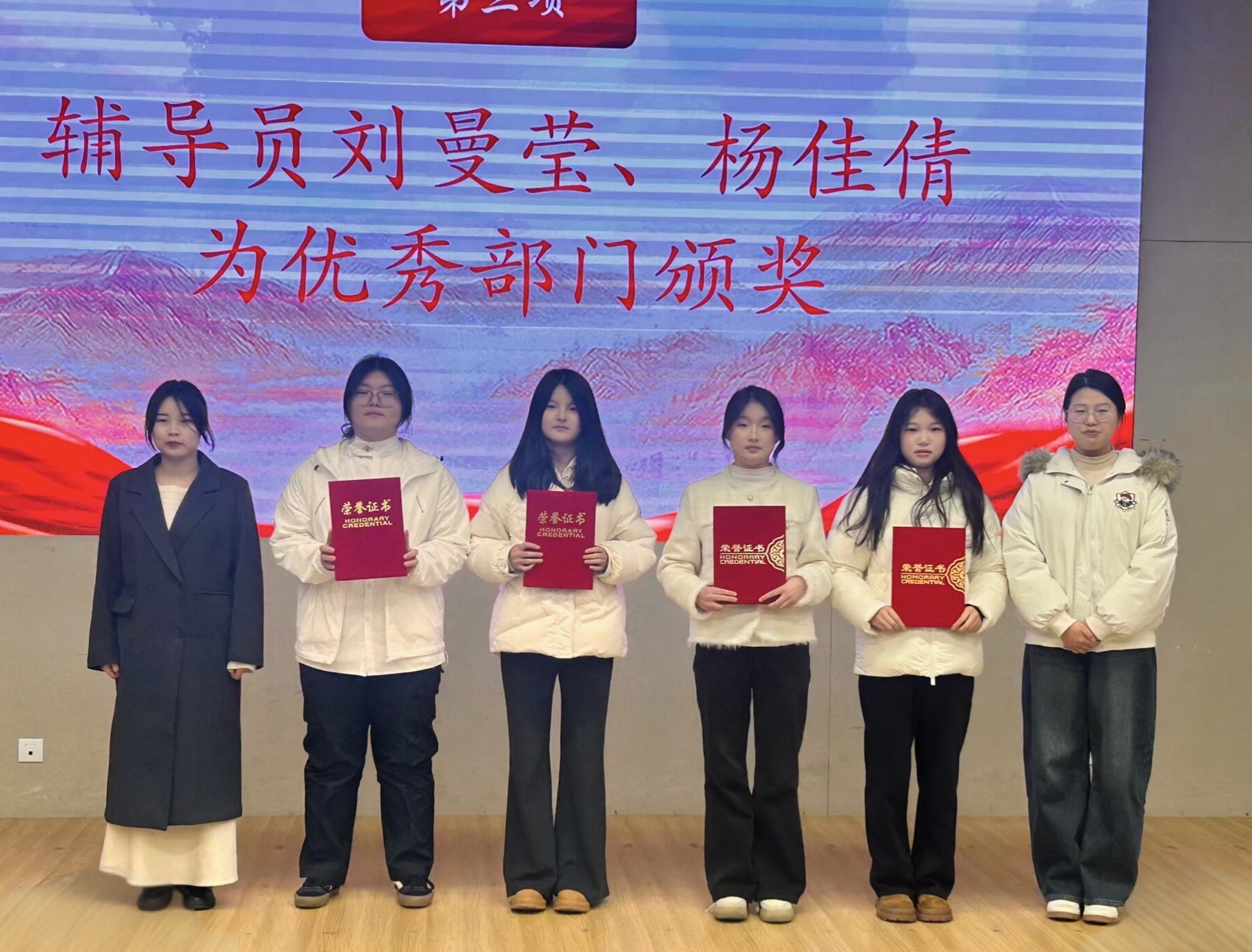 大会第二项,卢佳智宣读2025年度表彰文件。辅导员卢佳智、滕宋云为优秀员工干部颁发荣誉证书,辅导员刘曼莹、杨佳倩为优秀部门代表颁奖。