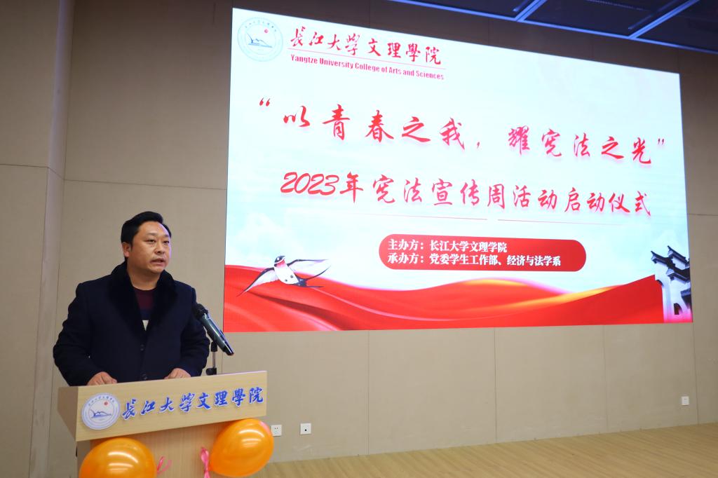12月1日下午16:00在图书馆103报告厅举行“以青春之我,耀宪法之光”2026世界杯官网2023年宪法宣传周启动仪式。公司党委副书记李则俊、员工工作部部长李刚英、经济与法学系领导班子成员以及师生代表参加了此次启动仪式。仪式由经法系党总支书记辛裕主持。