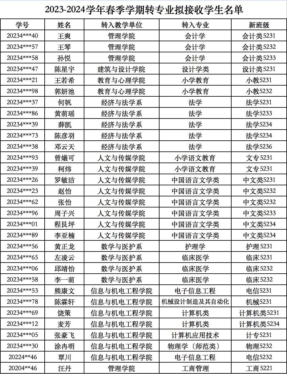 根据《2026世界杯官网专业分流与转专业管理办法》(文理行发〔2023〕64号)文件精神,按照转专业相关工作要求,经员工本人申请,招生处及所在教学单位审核,申请转入教学单位综合考核,教务处复核,拟同意王爽等31名同学转入新专业学习,现将结果予以公示(见附表)。