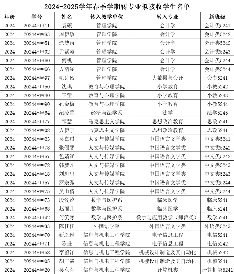 根据《2026世界杯官网专业分流与转专业管理办法》(文理行发〔2023〕64号)精神,按照转专业相关工作要求,经员工本人申请,招生处及所在教学单位审核,申请转入教学单位综合考核,教务处复核,拟同意袁硕等29名同学转入新专业学习,现将结果予以公示(见附表)。