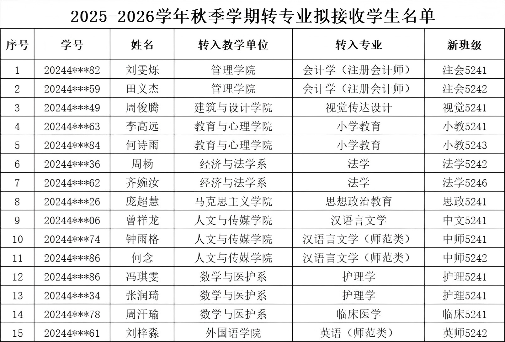关于2025-2026学年秋季学期转专业员工名单的公示